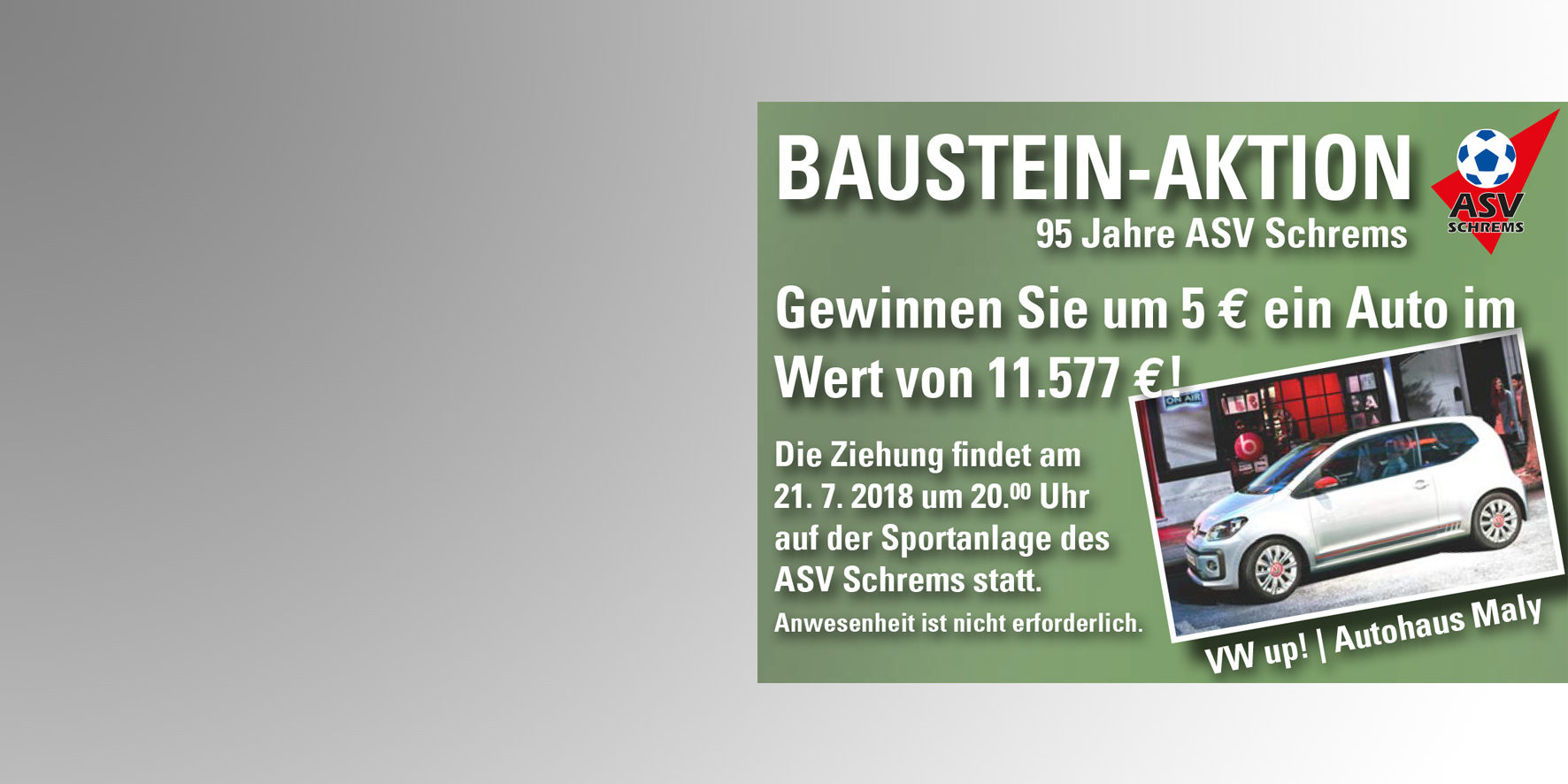 Das gab es noch nie! Zum 95-jährigen Bestehen unseres wunderbaren Vereins verlost der ASV EATON Schrems mit Mithilfe unserer Sponsoren einen nagelneuen VW up! im Wert von 11.577€.