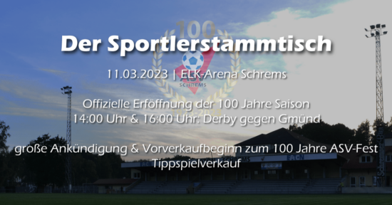 //Facebookveranstaltung Der ASV EATON Schrems lädt ein zum traditionellen #Sportlerstammtisch, um die Vorbereitungsphase gebührend abzuschließen. Hierzu möchten wir alle Gönner, Fans und Unterstützer sehr herzlich in die ELK-Arena einladen! Die Highlights an diesem Tag: DERBY 14:00 Uhr: Testspiel: ASV Schrems Res. – SC Gmünd Res. (je nach Witterung eventuell am Trainingsplatz) 16:00 Uhr: Testspiel: ASV Schrems…